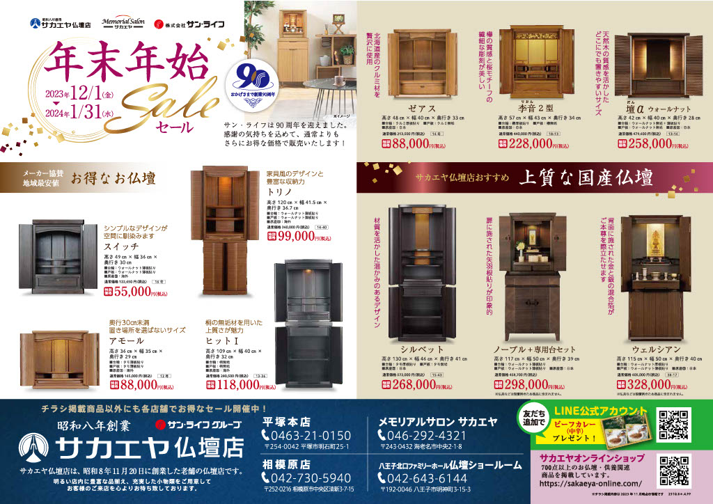 2023年12月1日(金)~2024年1月31日(水)まで、サカエヤ仏壇店では年末年始セールを行っております。