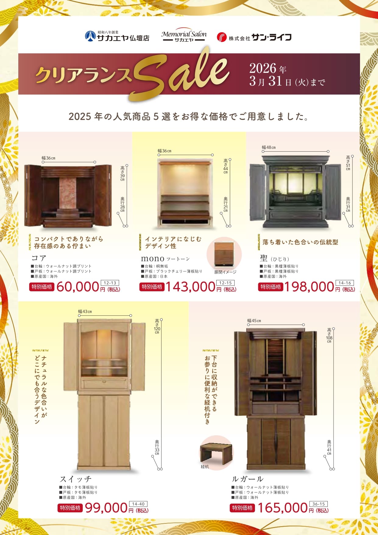 サカエヤ仏壇店では2026年3月31日(火)までクリアランスセールを行っております。